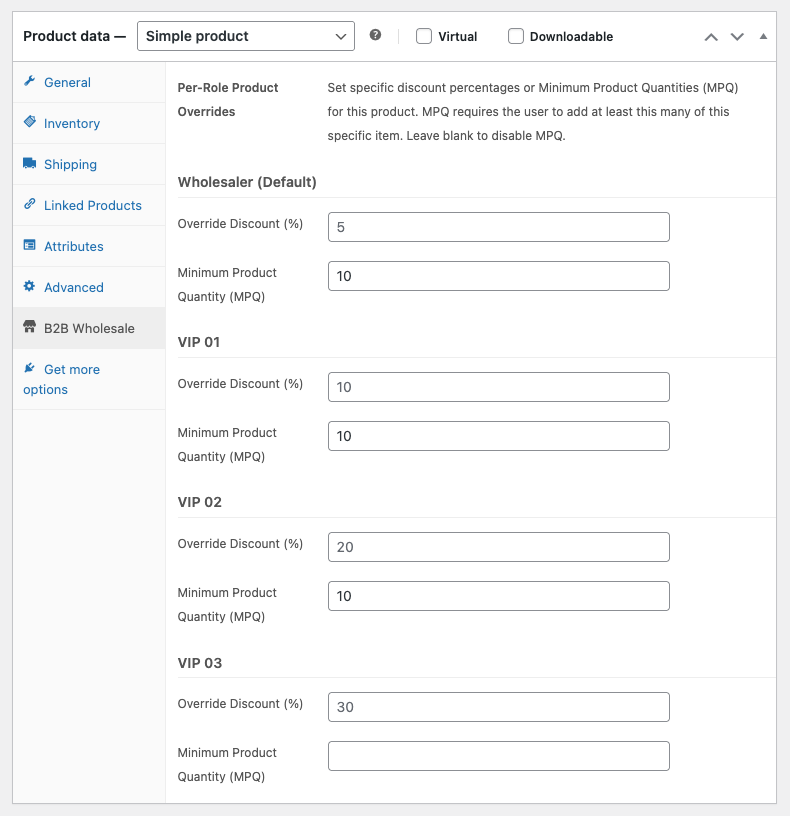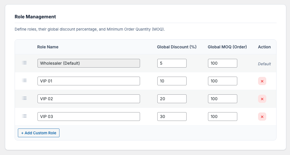 Enforce volume buying by setting a Global Minimum Order Quantity (MOQ) for an entire transaction based on a user’s role. For granular control, configure roles at the single-product level using Minimum Product Quantity (MPQ). The smart cart intelligently prompts users to adjust their totals before checkout.