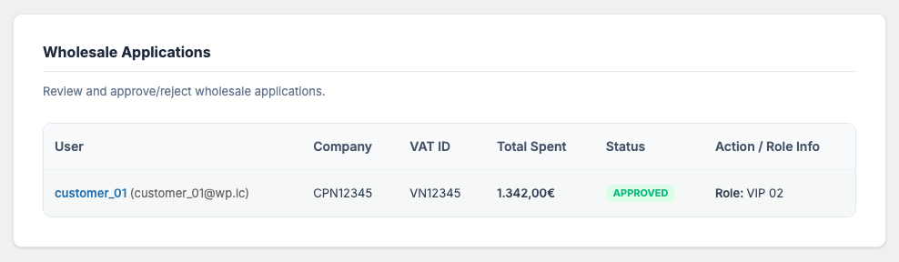 Place this shortcode comfortably on any page to render a dedicated, beautiful B2B Wholesale Application form outside of the default My Account area. It securely gathers Company Name and VAT ID, passing them instantly to the Admin approval queue.