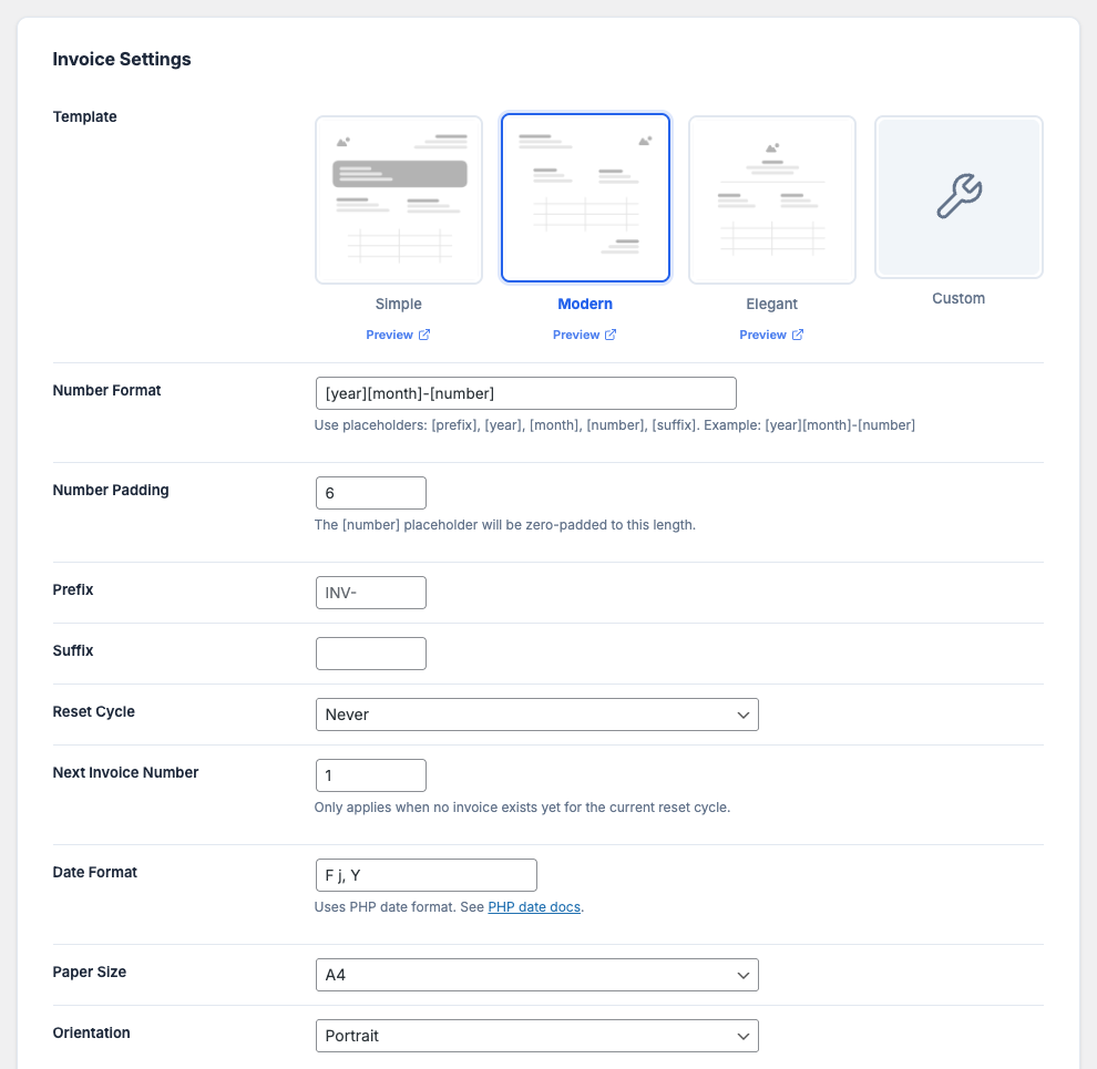- Sequential Numbering: Robust sequential invoice numbering with configurable format (`[prefix][year][number][suffix]`), reset cycles (monthly/yearly), and zero-padding.