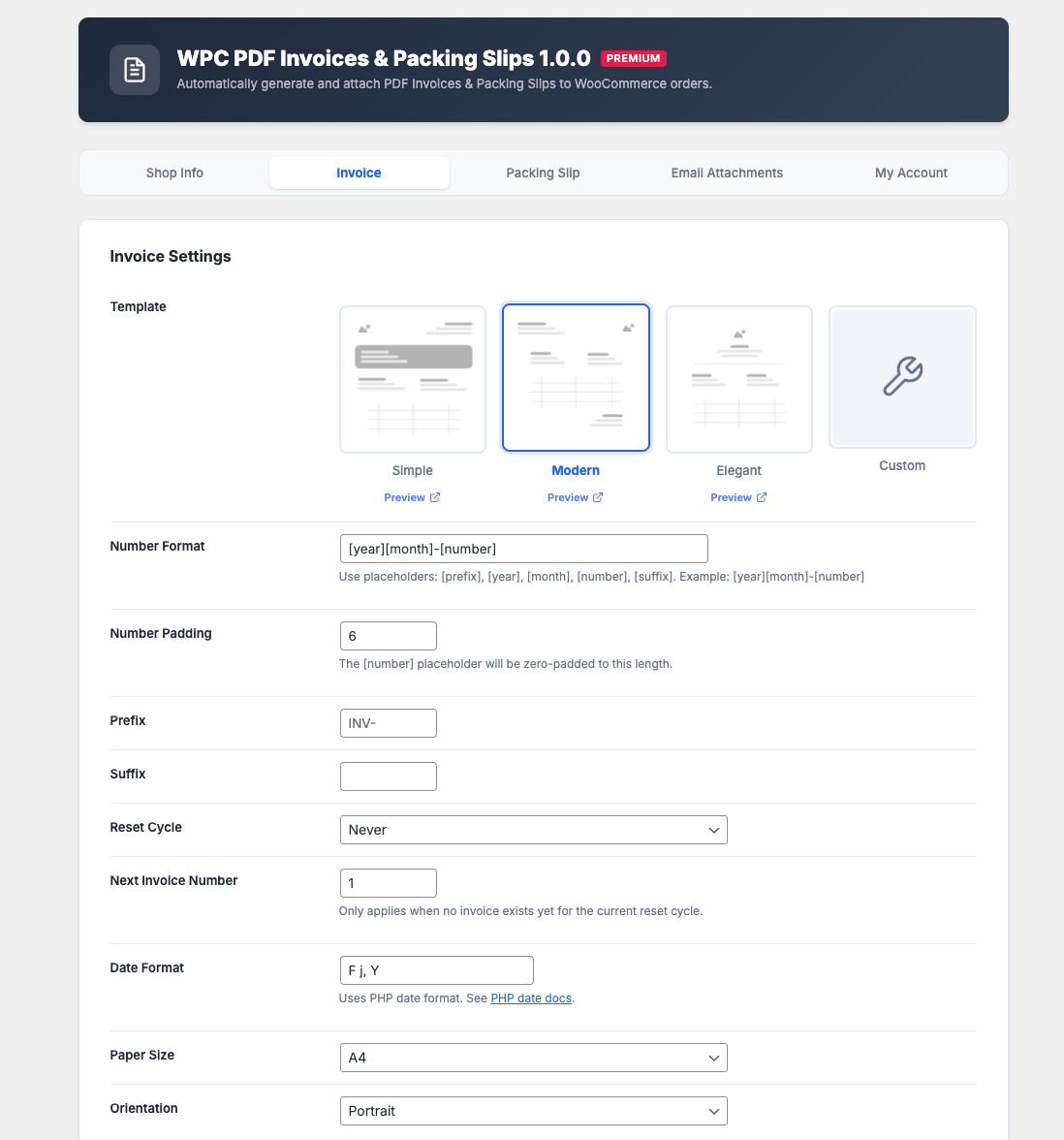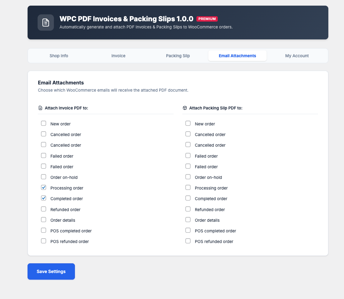 - Automatic Email Attachment: Attach PDF invoice and/or packing slip to any standard WooCommerce email (Processing, Completed, etc.).