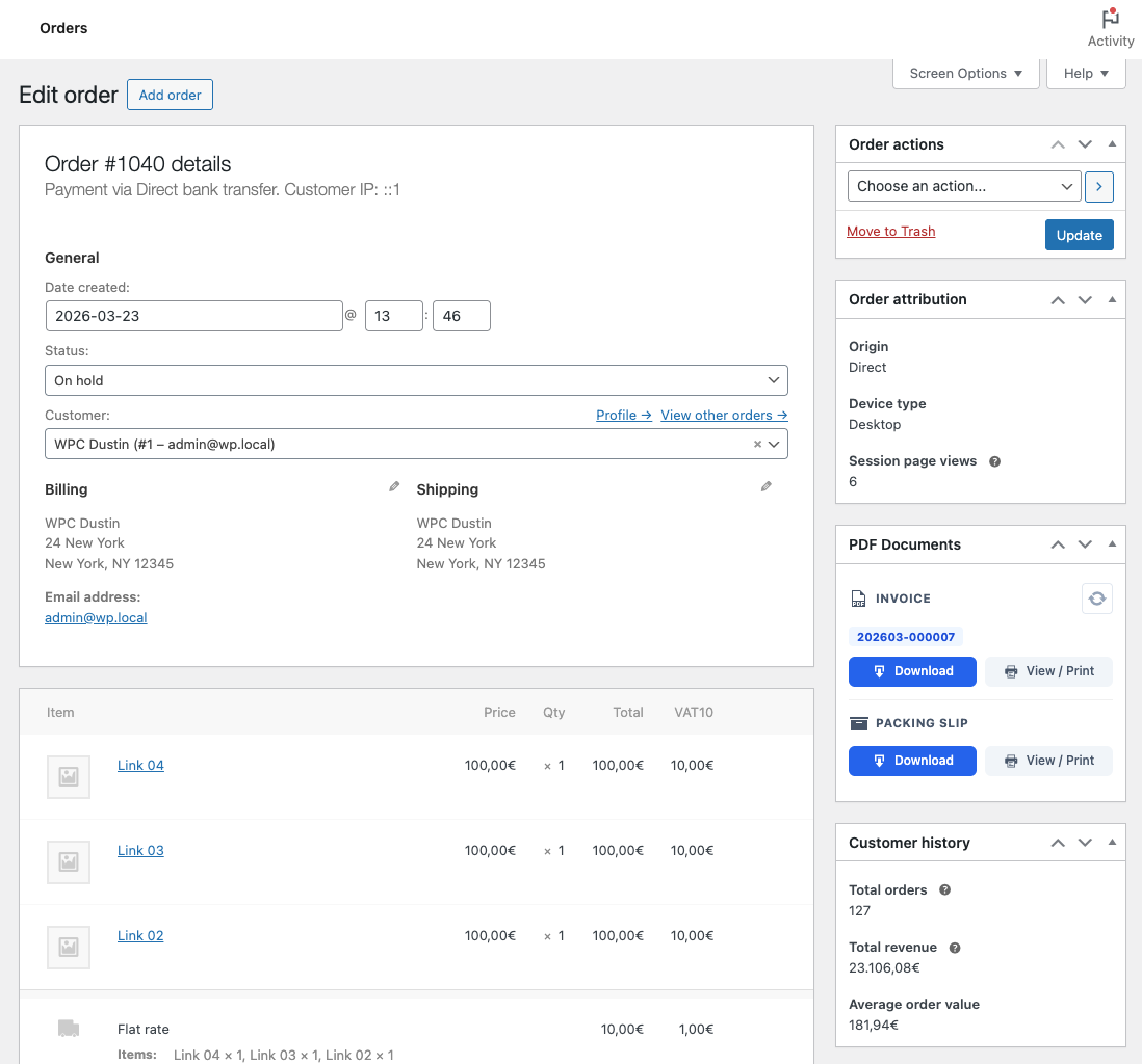 - Bulk Actions: Download multiple invoices or packing slips at once as a ZIP archive from the order list.