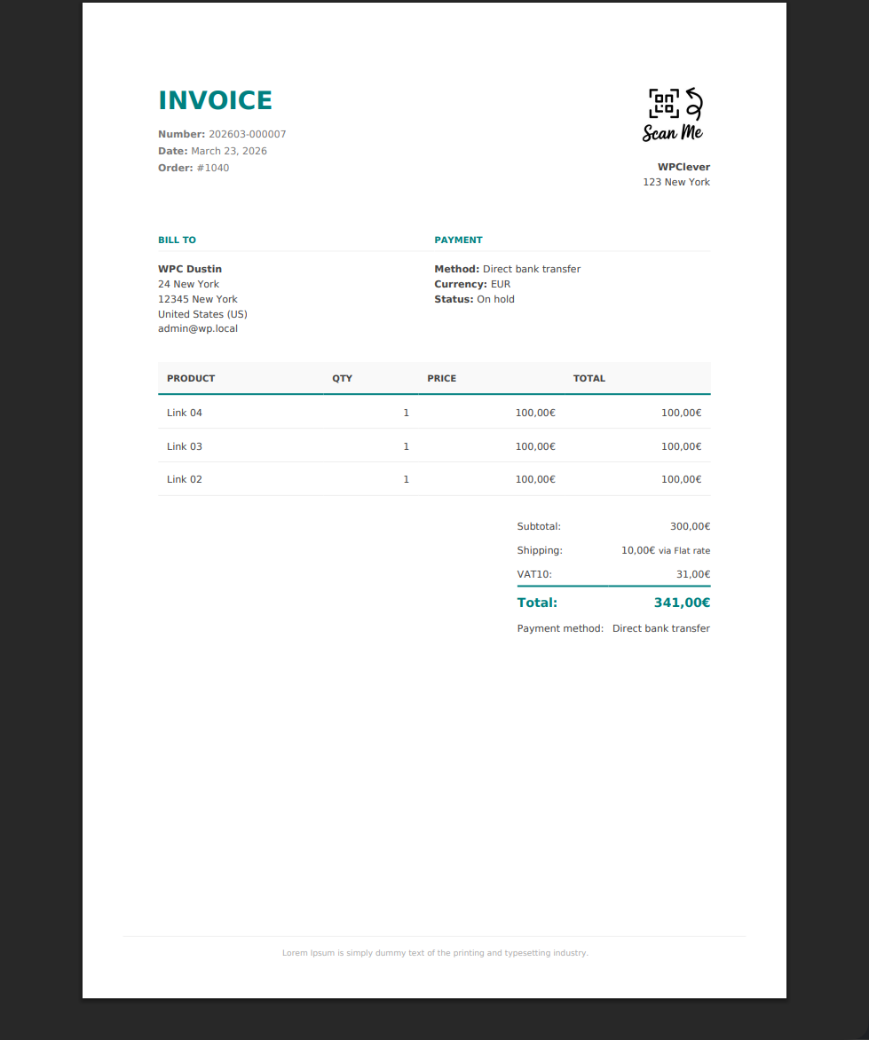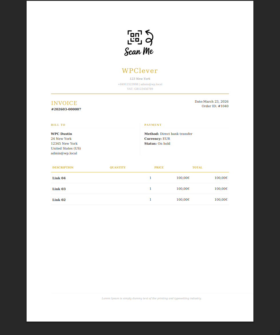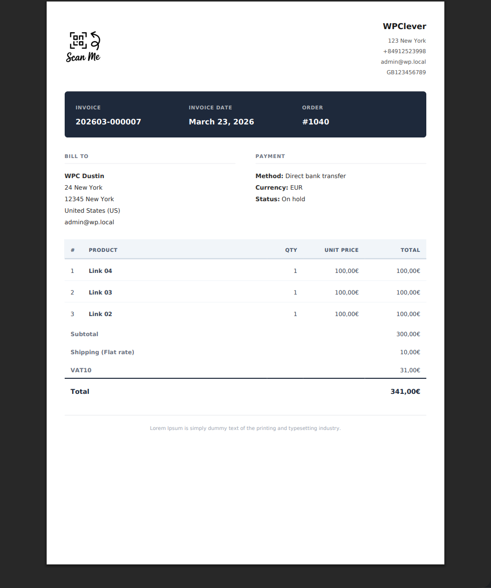 What sets this plugin apart is its robust Custom Template Engine. You are not limited to the built-in professional designs; you can easily create, upload, and preview your own layouts. With a dedicated Preview System, you can instantly see how your templates look using data from your latest order—without assigning real invoice numbers or saving temporary files to your database.