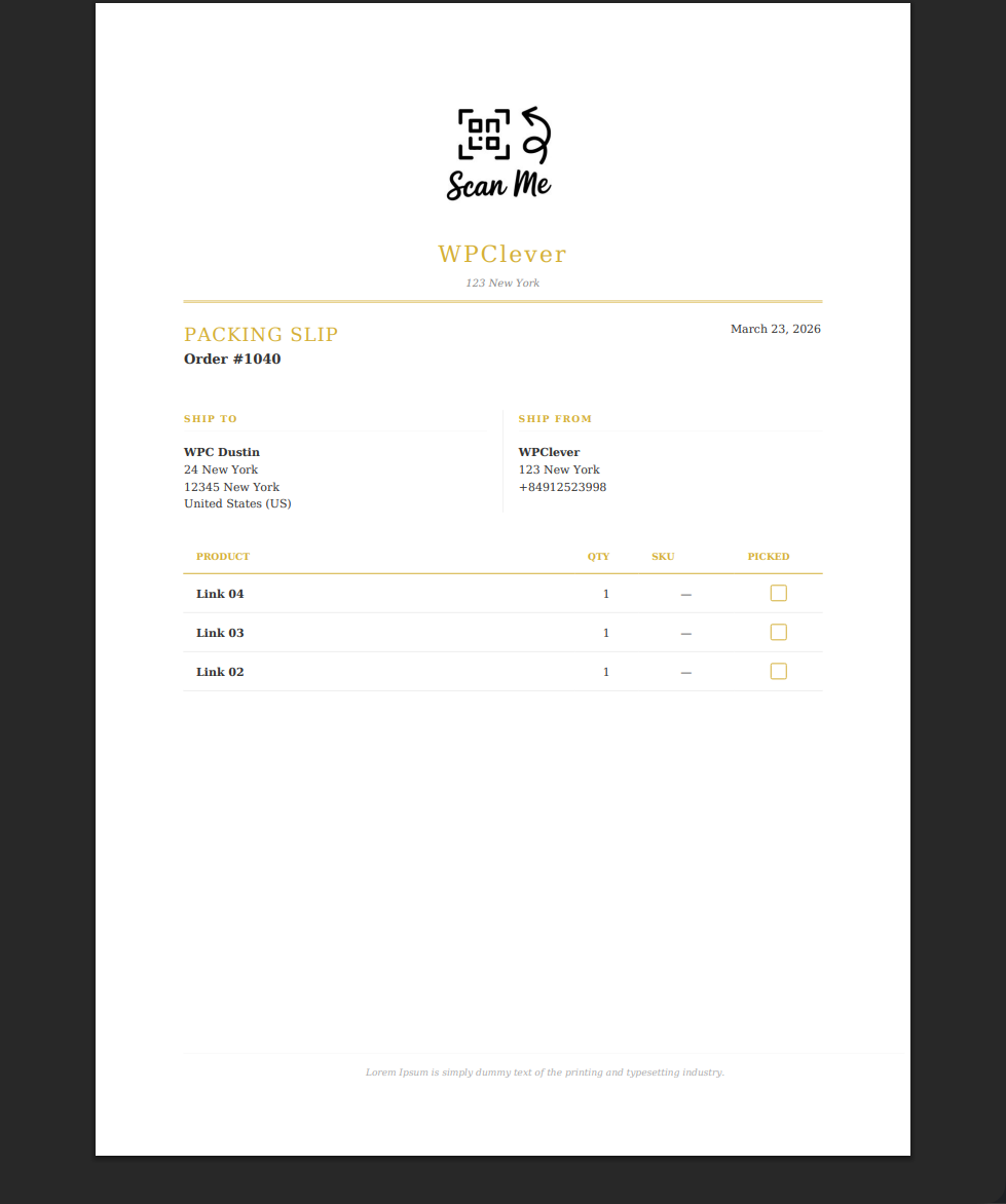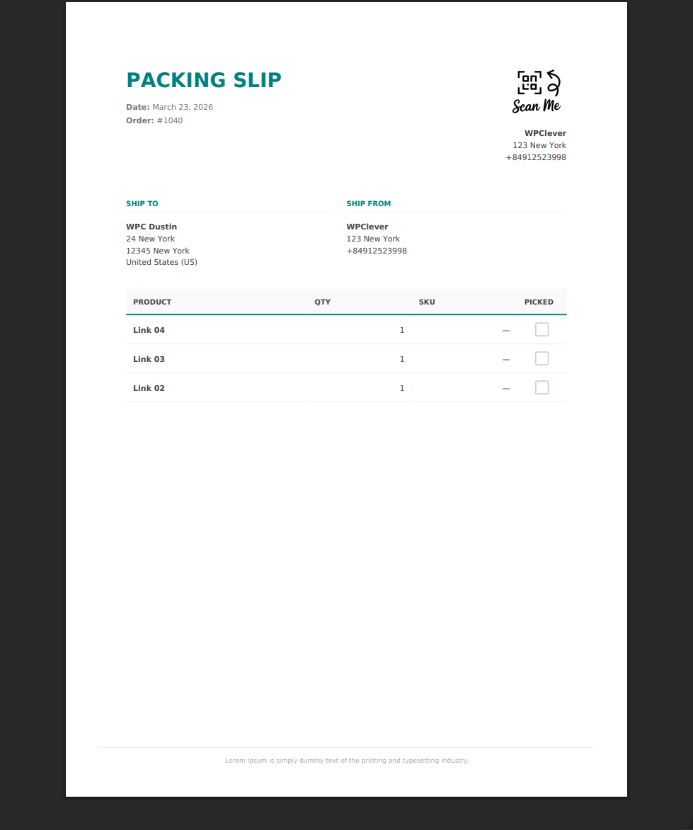- Flexible Paper Settings: Independence between invoice and packing slip for paper size (A4, Letter, Legal) and orientation.
